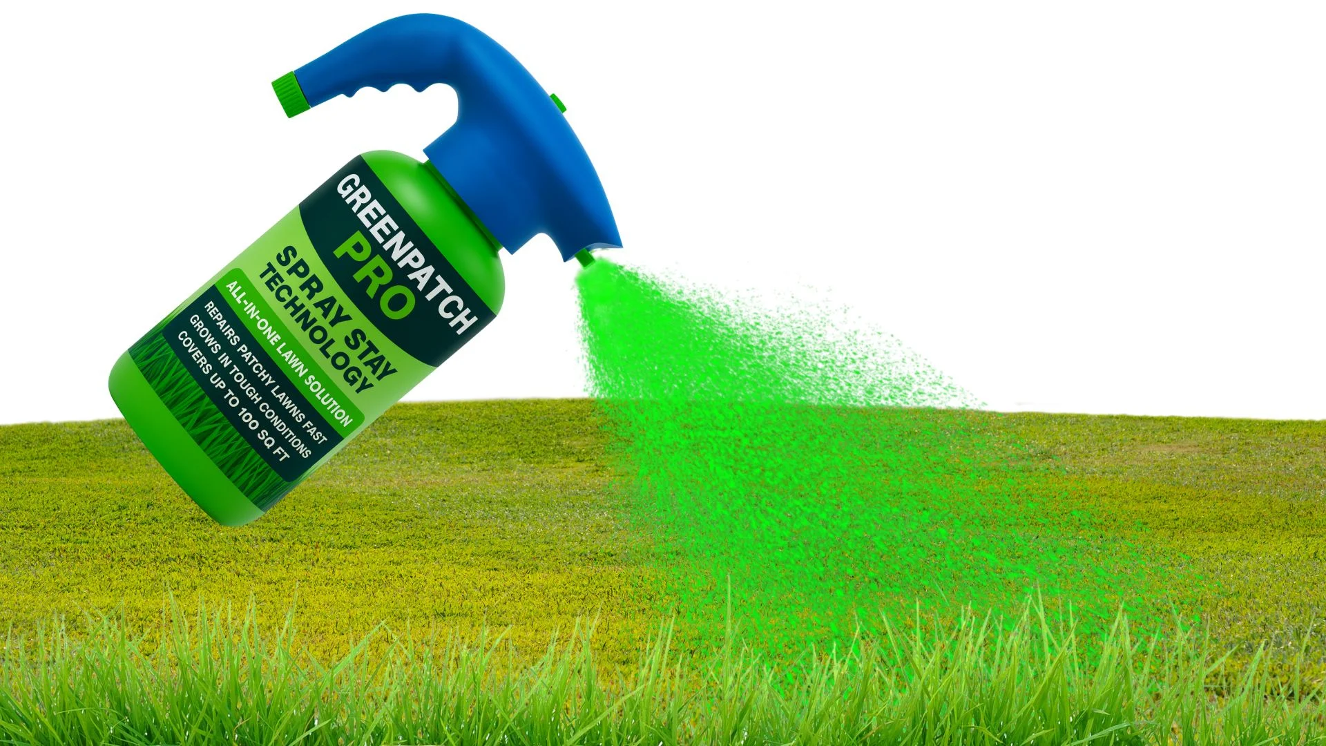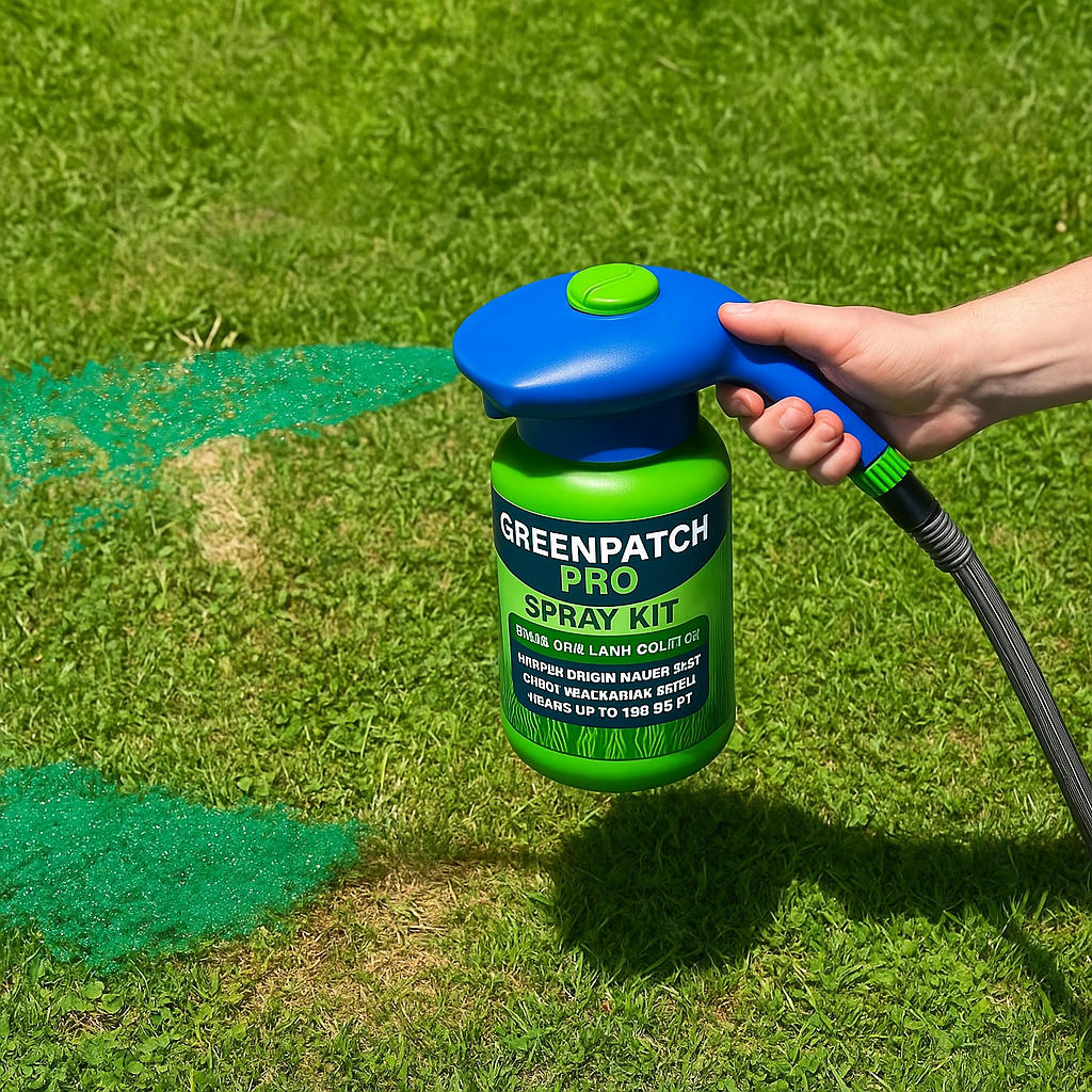 GreenPatch Pro Spray Kit is a professional-grade lawn repair solution that combines premium grass seed, eco-safe fertilizer, and soil conditioner into one powerful green mousse. It sprays directly from your hose and sticks to the soil, showing exactly where you've seeded.