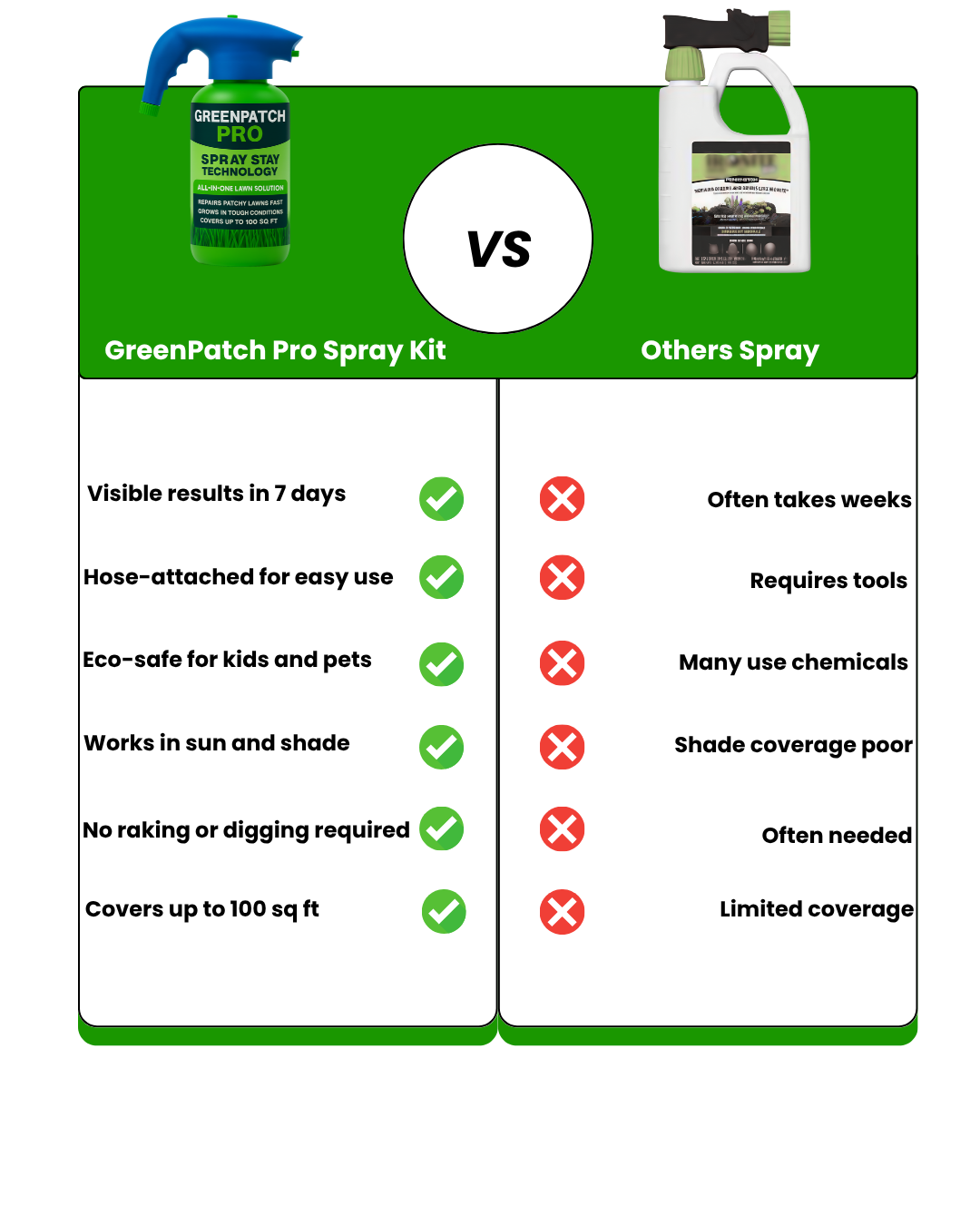 Before GreenPatch Pro, I tried every common method: overseeding, patch kits, even professional lawn care. They were all expensive, slow, or ineffective.